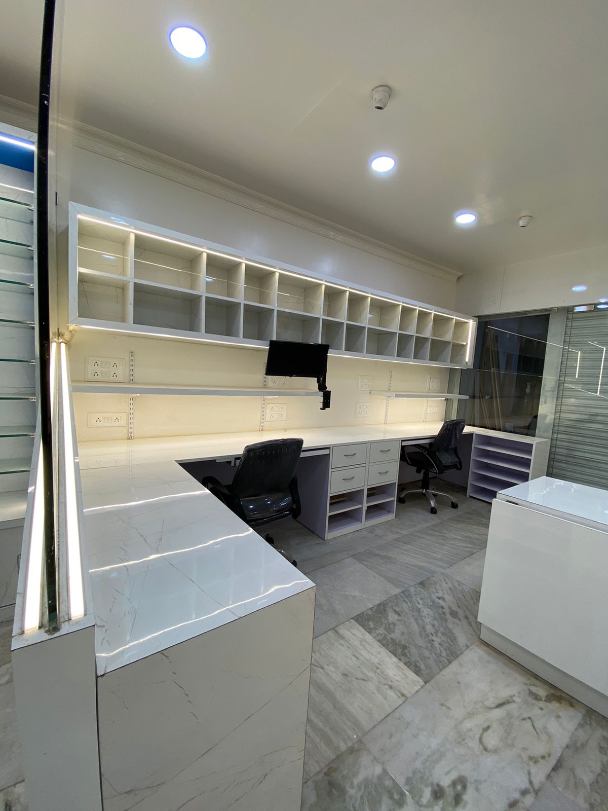 This commercial workspace is designed with a sleek and modern approach, focusing on productivity and functionality. Clean lines, minimal aesthetics, and a well-planned layout create an efficient working environment. Thoughtful lighting and balanced design elements enhance comfort and professionalism, resulting in a space that supports daily operations while reflecting a contemporary and refined business identity.
